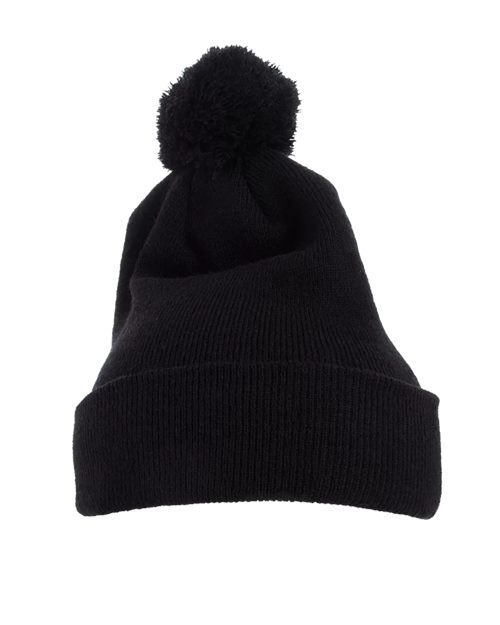 Pom pom beanie that is densely knit for easy embroidery