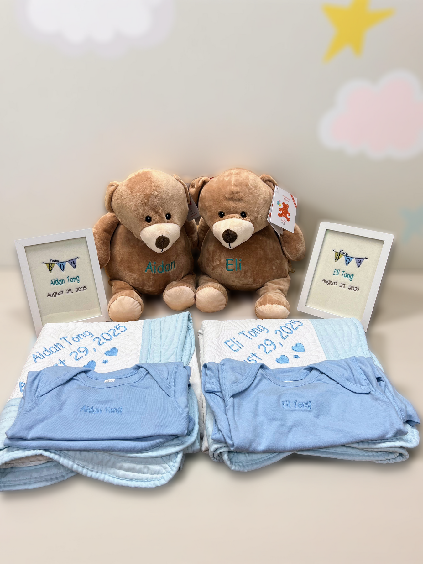 Our personalized baby gift set includes a soft embroidered baby blanket, a matching onesie, and an adorable plush bear — each beautifully customized with the baby’s name and birth date.